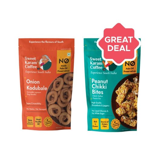 Sweet Karam Coffee Onion Kodubale/ Chakli, - No Palm Oil + Peanut Chikki by Combo : 95 g + 150 g