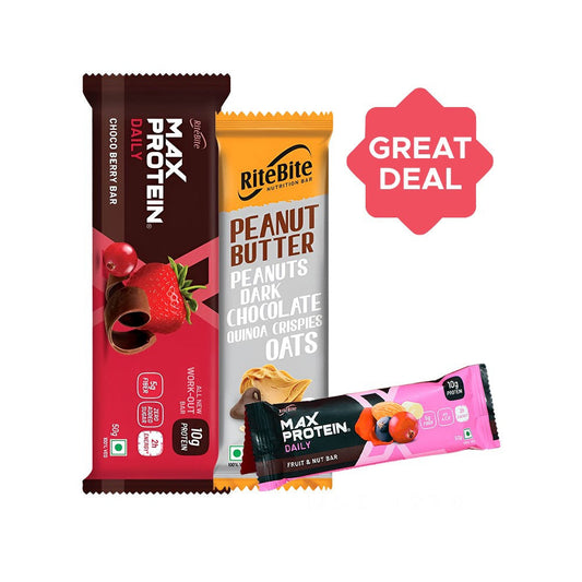 RiteBite Max Protein Daily Choco Berry Protein Bar + Max Protein Energy Bar (Fruit and Nut) + Peanut Butter Dark Chocolate Quinoa Crispies Oats Nutrition Bar Combo : 50 g + 50 g + 40 g