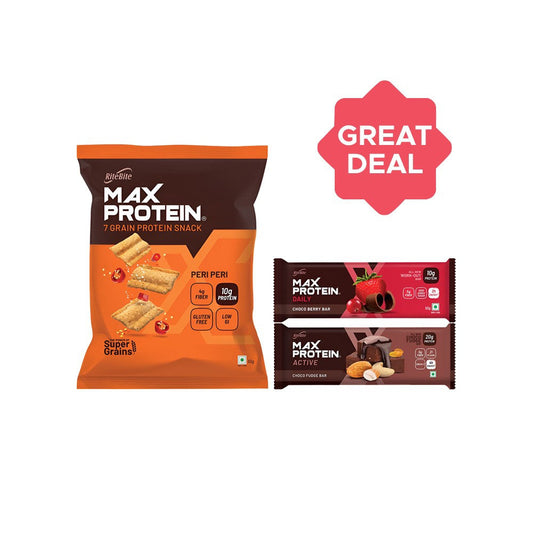 RiteBite Max Protein Active Choco Fudge Nutrition Bar + Max Protein Peri Peri Chips + Max Protein Daily Choco Berry Protein Bar Combo : 75 g + 60 g + 50 g