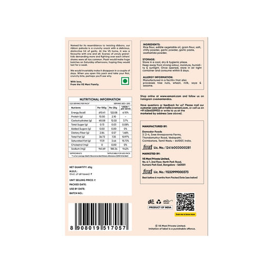 VS Mani & Co. Garlic Ribbon Murukku, No Palm Oil - Pack of 4 : 4 x 65 g
