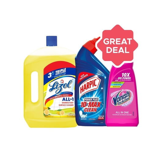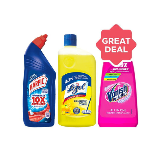 Vanish Oxi Action Fabric Stain Remover + Harpic Disinfectant Liquid Toilet Cleaner - (Original) + Lizol Disinfectant Surface & Floor Cleaner (Citrus) Combo : 400 ml + 1 ltr + 1 ltr