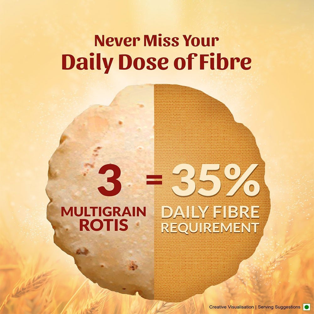 To prepare dough for chapatis or parathas, take the desired amount of Aashirvaad Multigrain Atta in a bowl. Gradually add water and knead to form a soft dough. Let it rest for 15-20 minutes. Roll out the dough into flat circles and cook on a hot tava until golden brown on both sides.