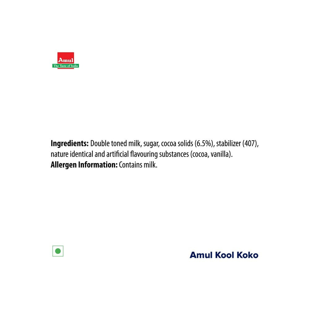 Introducing Amul Kool Koko Chocolate Flavoured Milk, the perfect treat for chocolate lovers of all ages! This delicious chocolate-flavored milk is made from high-quality ingredients, offering a delightful taste and creamy texture that will satisfy your cravings. Whether you're looking for a refreshing drink to enjoy on its own or a tasty addition to your breakfast routine, Amul Kool Koko is sure to please.