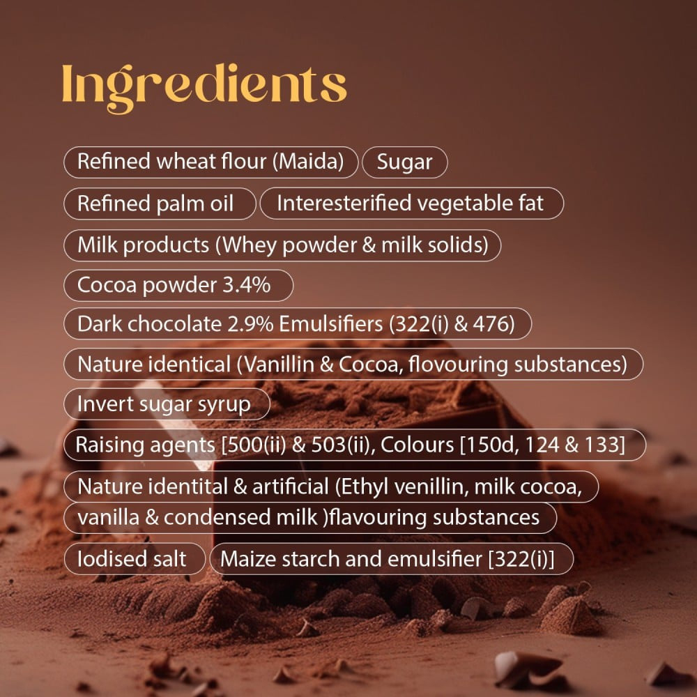 - Key Ingredients: Wheat Flour, Sugar, Chocolate, Margarine, and more