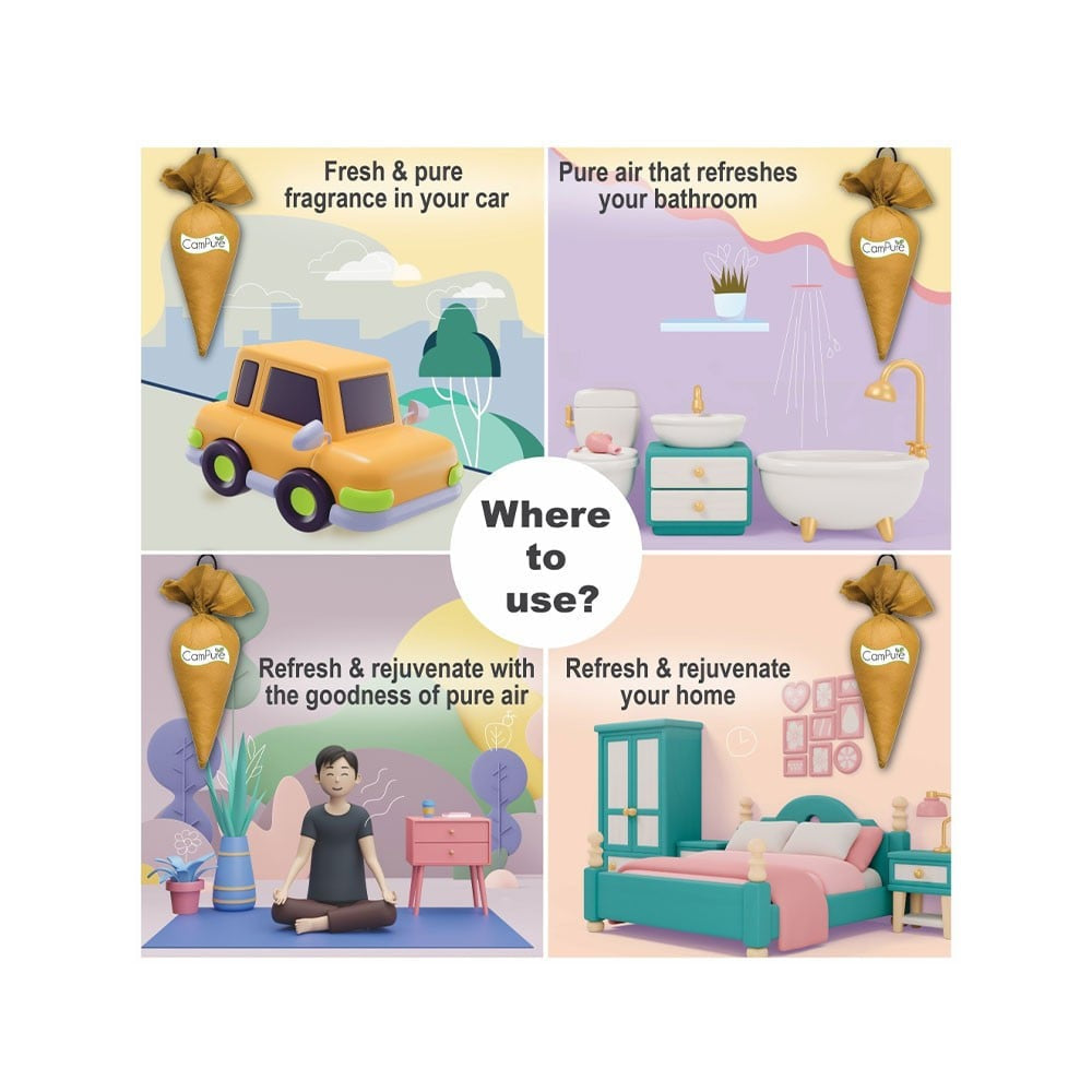 To use the CamPure Organic Camphor Car Freshener Cone, remove it from its packaging. Hang the cone from your rearview mirror or place it in a cup holder. Allow the natural oils to release their fragrance. Adjust the position as needed to achieve your desired scent strength.