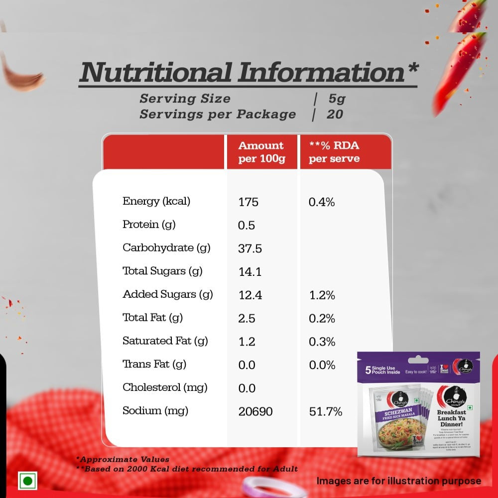 Ching's Secret Schezwan Fried Rice Masala Instant Mix is your go-to solution for a quick and delicious meal! This convenient instant mix allows you to create flavorful Schezwan fried rice in just minutes. With a perfect blend of spices, it's ideal for those busy days when you crave something tasty yet easy to prepare. Each pack contains 5 single-use pouches, making it perfect for meal prep or quick fixes.