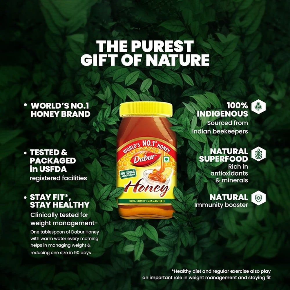Dabur Honey is the world's No.1 honey brand, renowned for its 100% pure honey without any sugar adulteration. Sourced from the finest bee farms, this premium honey is perfect for enhancing your food, beverages, and health routines. Enjoy the rich taste and numerous health benefits with every drop of Dabur Honey.