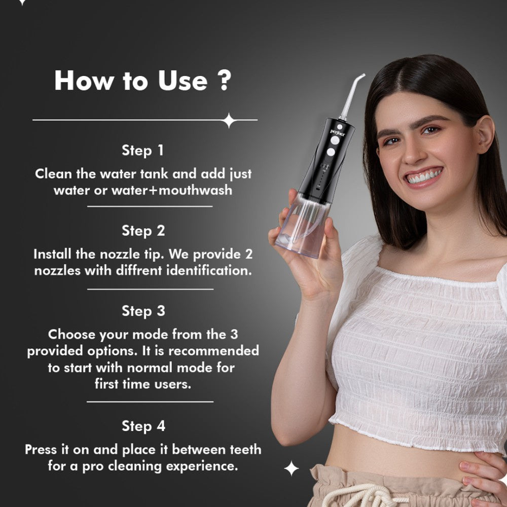 1. Fill the water reservoir with lukewarm water. 2. Select your preferred pressure setting. 3. Lean over the sink and place the flosser tip in your mouth. 4. Activate the flosser and guide the water stream along the gum line and between your teeth. 5. Spit out the water and debris, and rinse your mouth after use.