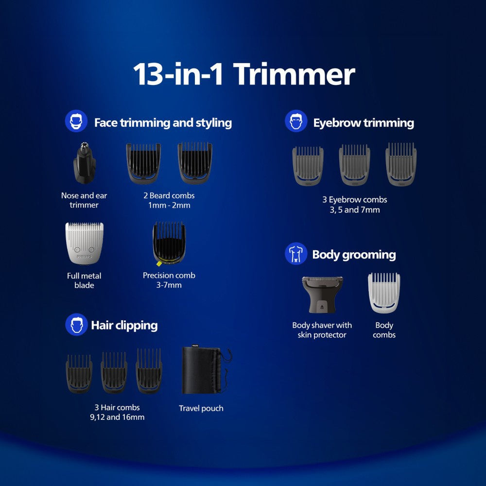 The Philips MG5930/65 13-in-1 Multi Grooming Trimmer is your ultimate grooming companion, designed to deliver precision and versatility for the modern man. This all-in-one trimmer offers a comprehensive solution for all your grooming needs, from beard trimming to hair cutting and body grooming. With its sleek grey design and robust features, you can achieve your desired look effortlessly and stylishly.