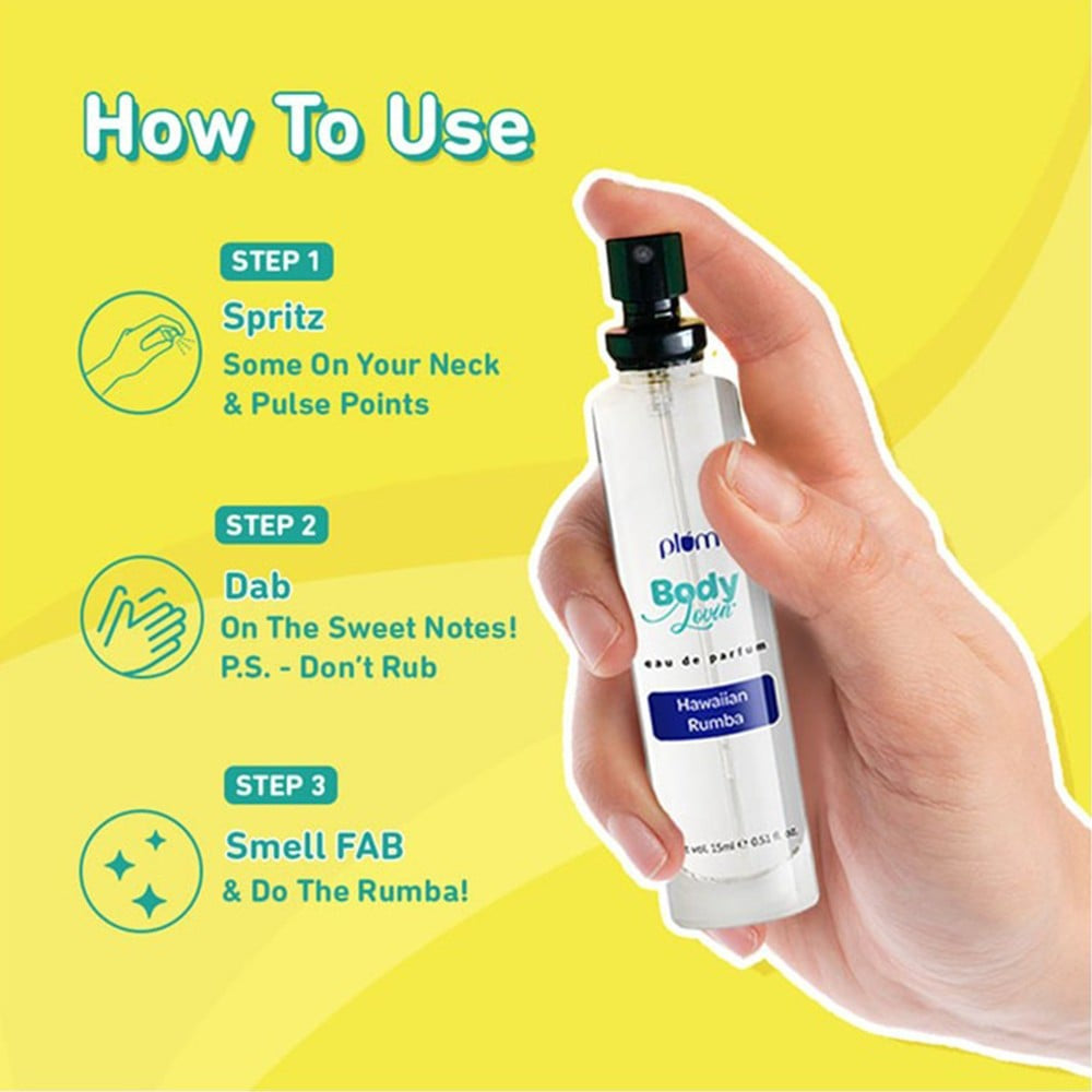 To enjoy the full benefits of Plum BodyLovin' Hawaiian Rumba Perfume, simply hold the bottle 6 inches away from your skin and spray on your pulse points. For a more intense fragrance experience, layer with other Plum BodyLovin' products in the same scent. Use it daily or whenever you want to feel a burst of freshness and confidence.