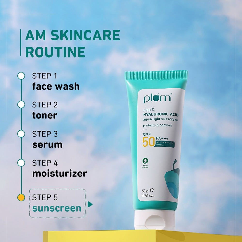 Introducing the Plum Cica & Hyaluronic Acid Aqua-Light Sunscreen (SPF 50 PA+++), your ultimate shield against harmful UV rays while keeping your skin hydrated and nourished. Formulated with the goodness of Cica and Hyaluronic Acid, this sunscreen provides broad-spectrum protection and a lightweight feel, making it perfect for daily use. Whether you're heading out for a sunny day or just want to protect your skin indoors, this aqua-light sunscreen has you covered.