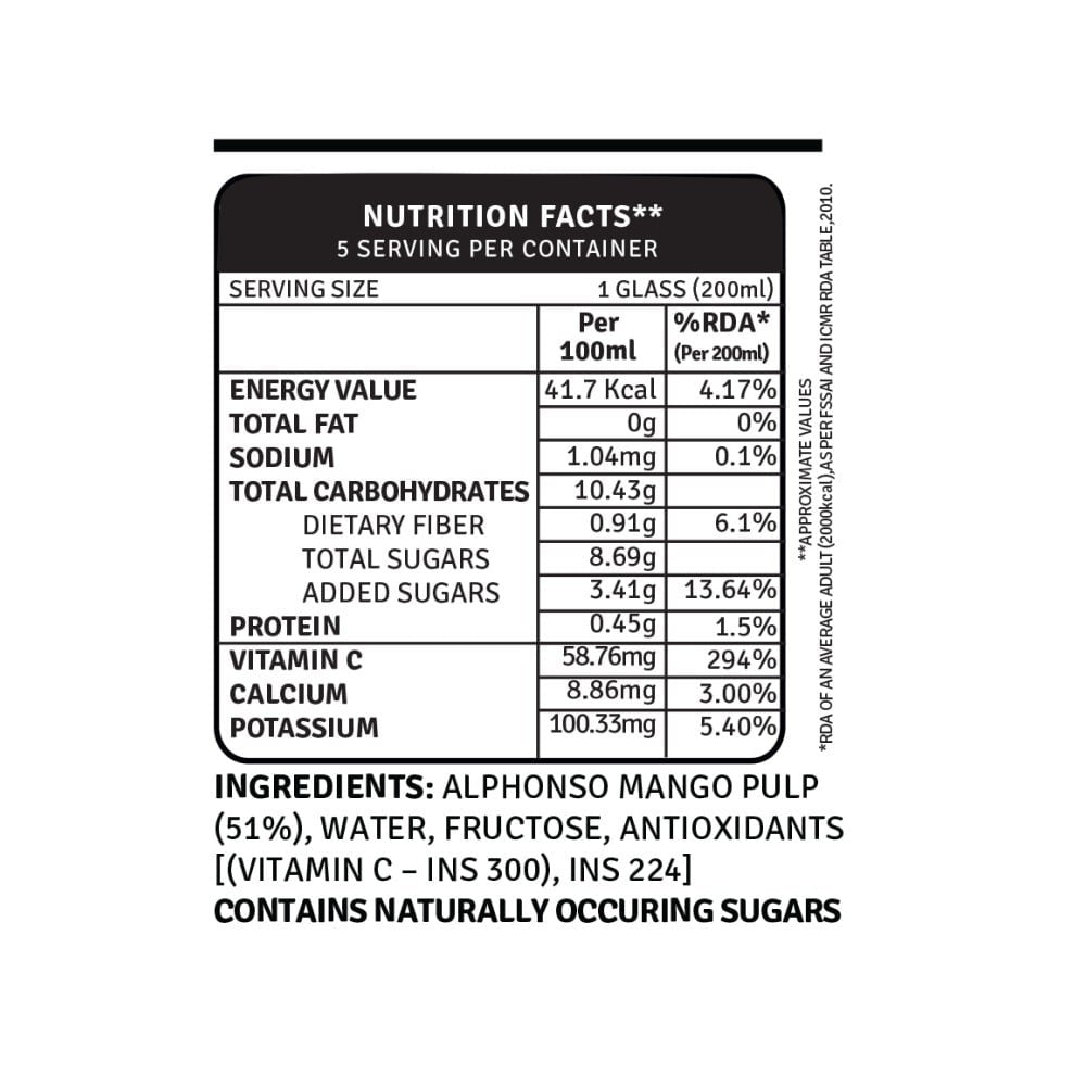 - Key Ingredients: Alphonso mango puree, water, sugar