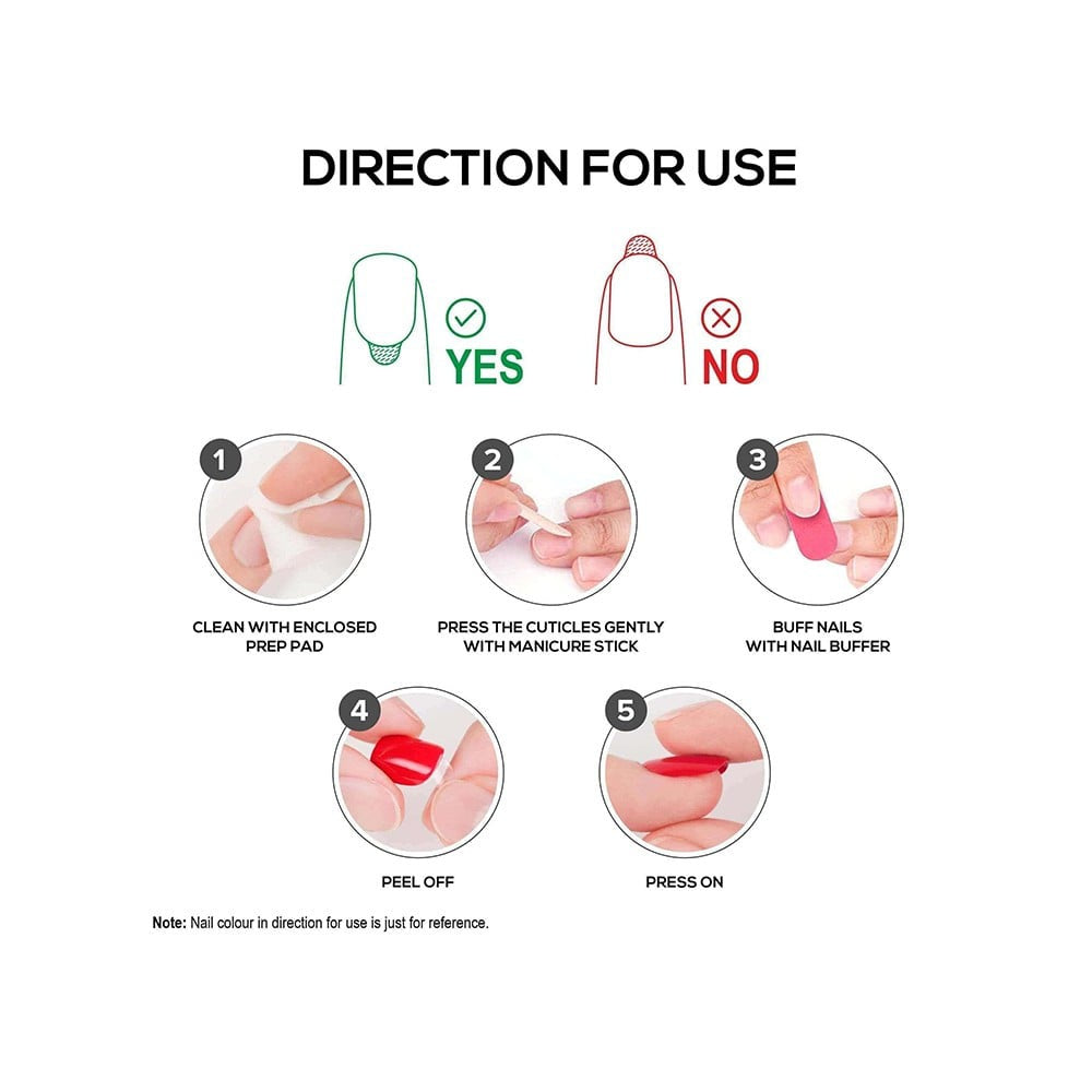 - Application: Simply press on and enjoy beautiful nails in minutes.