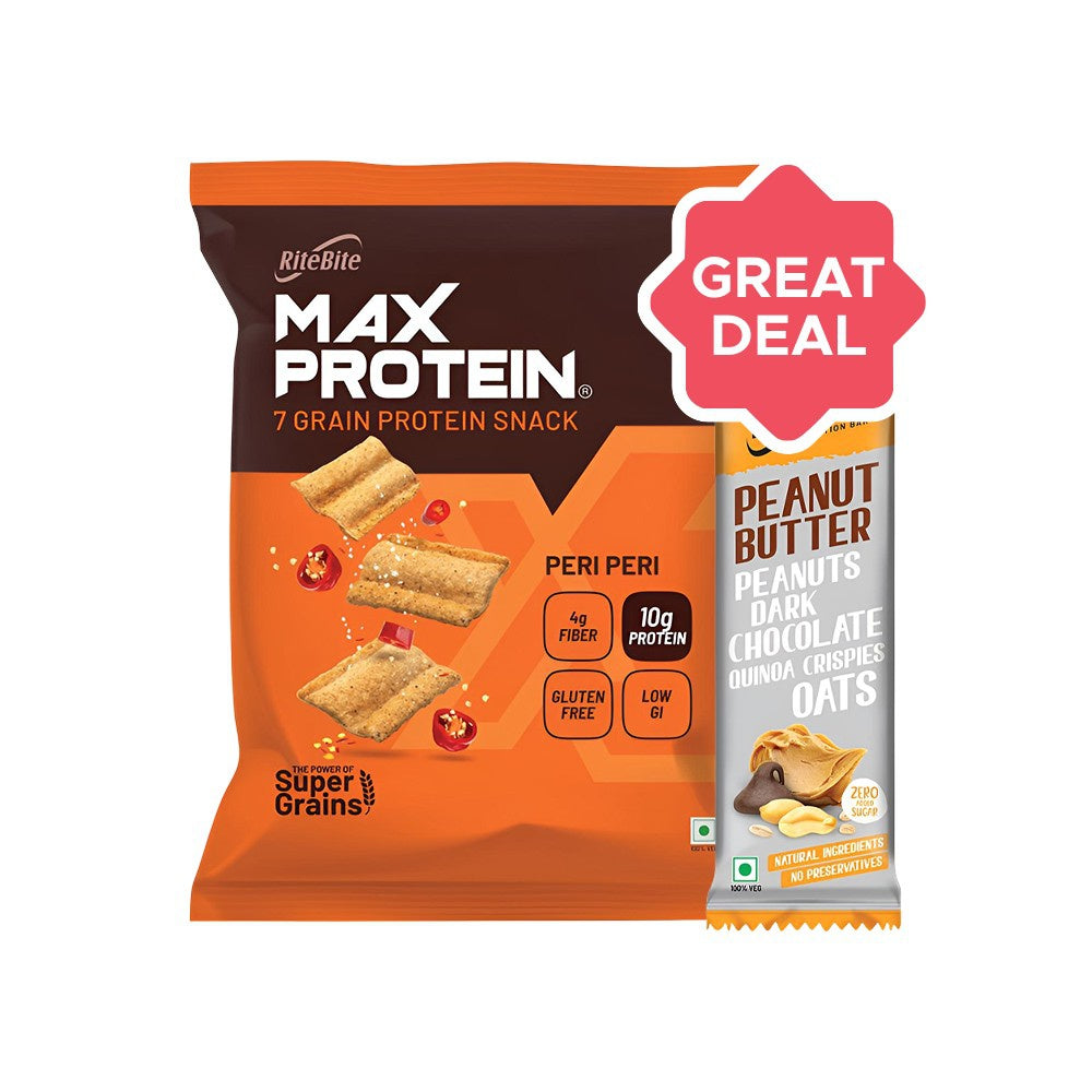 RiteBite Max Protein Peri Peri Chips + Peanut Butter Dark Chocolate Quinoa Crispies Oats Nutrition Bar Combo : 60 g + 40 g