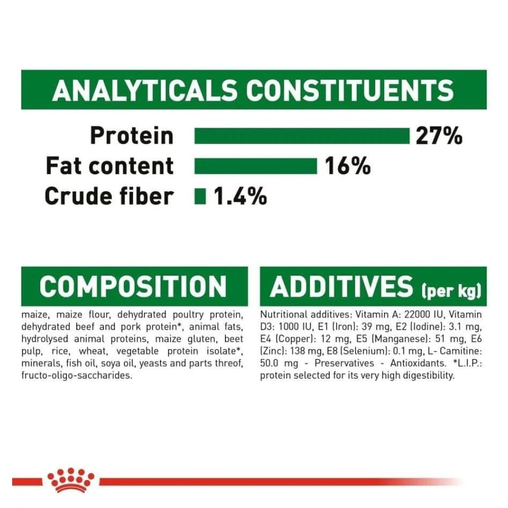 Serve the recommended amount based on your dog's weight and activity level. Ensure fresh water is available at all times. Transition to Royal Canin gradually over a week to avoid digestive upset.