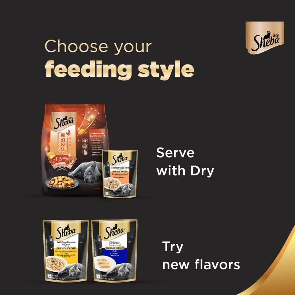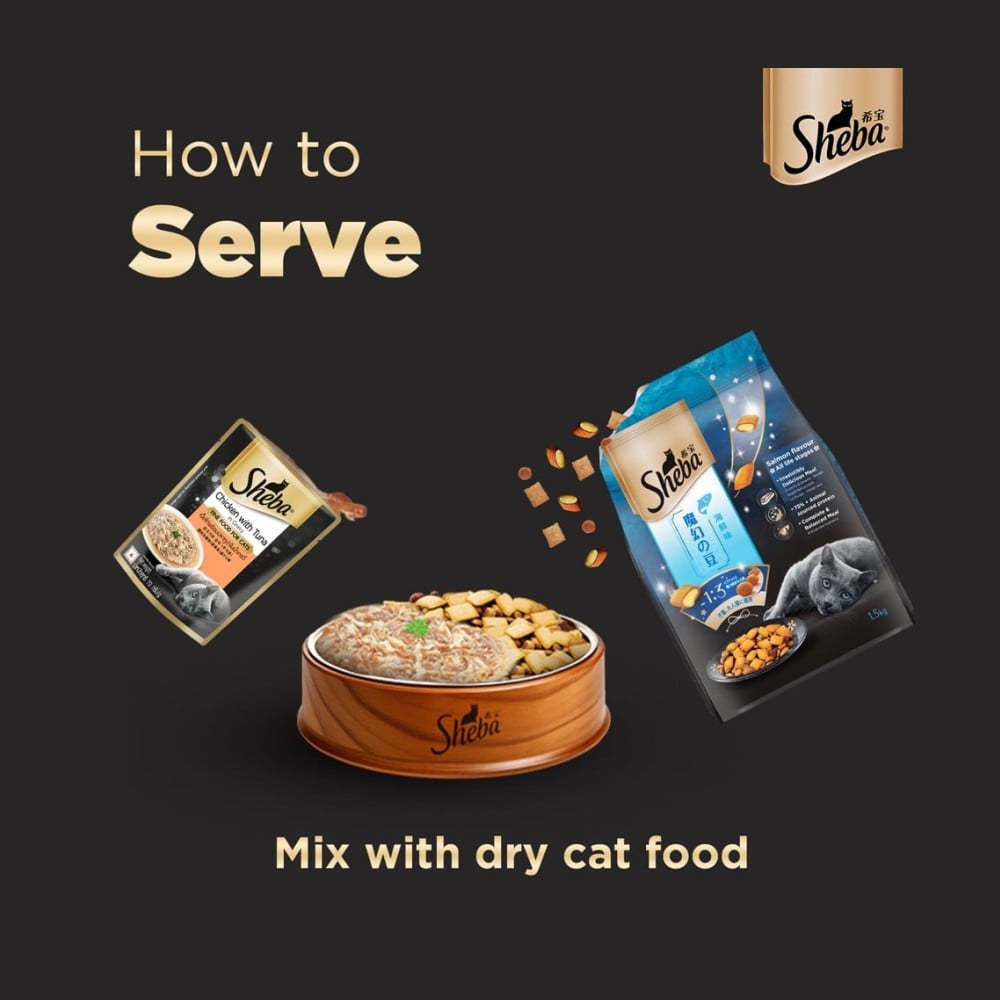 Feed Sheba Chicken with Tuna Adult Wet Cat Food as a complete meal or as a delicious topper to dry cat food. Ensure your cat has access to fresh water at all times. Adjust portion sizes based on your cat's weight and activity level for optimal health.