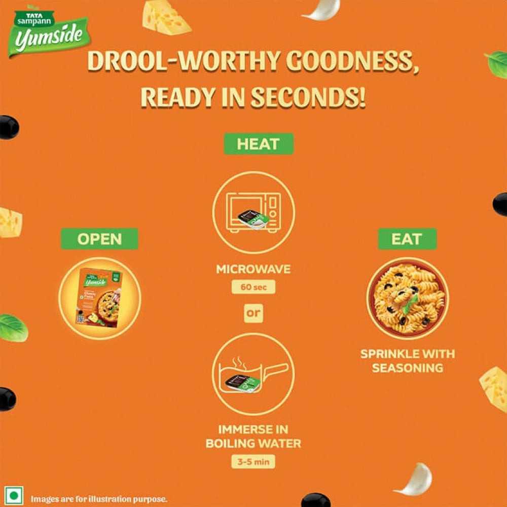 Experience the delightful taste of Tata Sampann Yumside Cheesy Pasta with Black Olives ?a ready-to-eat meal that combines the creamy goodness of cheese with the rich flavor of black olives. Perfect for a quick lunch or a comforting dinner, this pasta dish is not only delicious but also convenient, making it an ideal choice for busy individuals and families alike. With its wholesome ingredients and enticing flavor, it? a meal that satisfies your cravings in no time!