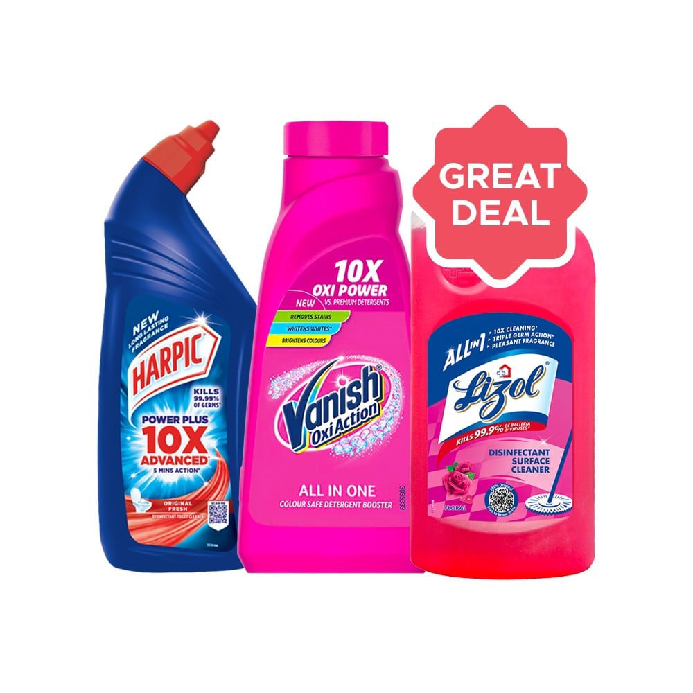 This powerful cleaning combo is your ultimate solution for tackling tough stains and disinfecting surfaces. The Vanish Oxi Action Fabric Stain Remover works wonders on fabrics, while the Harpic Disinfectant Liquid Toilet Cleaner ensures your toilet is spotless and hygienic. Meanwhile, the Lizol Disinfectant Surface & Floor Cleaner leaves a fresh floral scent in your home. This trio combines effectiveness and pleasant fragrances to keep your living spaces clean and inviting.