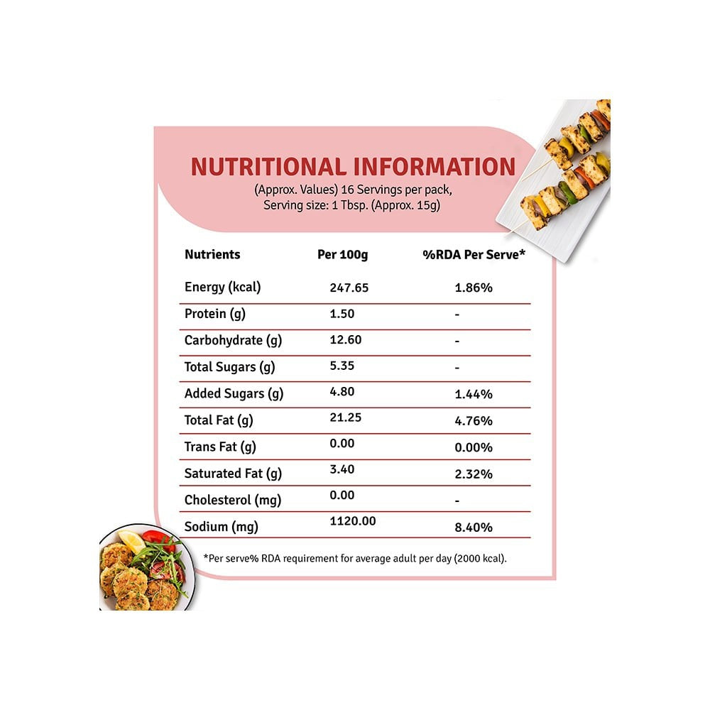 - Key Ingredients: Vegetable Oil, Water, Vinegar, Sugar, Tandoori Spices, Modified Starch, Salt, and Stabilizers.
