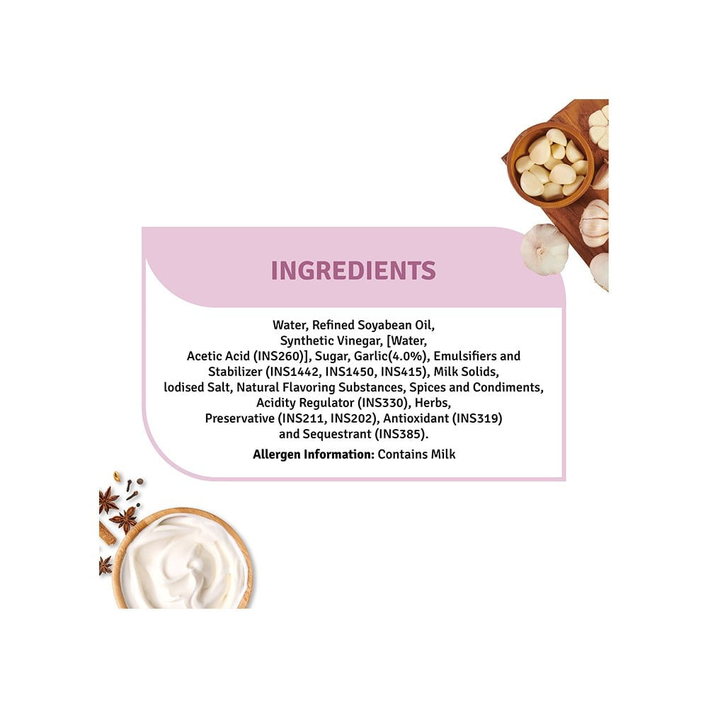 - Key Ingredients: Vegetable Oil, Water, Sugar, Garlic Powder, Vinegar, Salt, Stabilizers, and Emulsifiers.