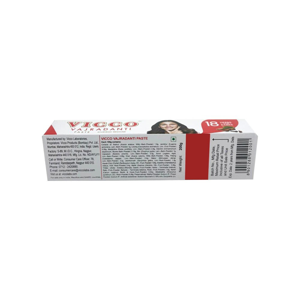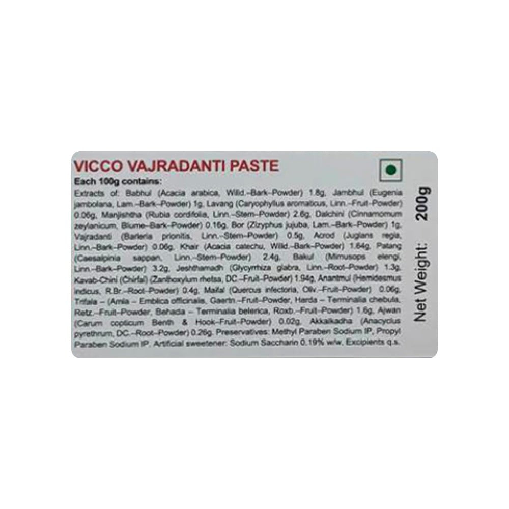 Apply a pea-sized amount of Vicco Vajradanti Ayurvedic Herbal Toothpaste on your toothbrush. Brush your teeth thoroughly for at least 2 minutes, ensuring to cover all areas of your mouth. Rinse well with water. For best results, use twice daily.