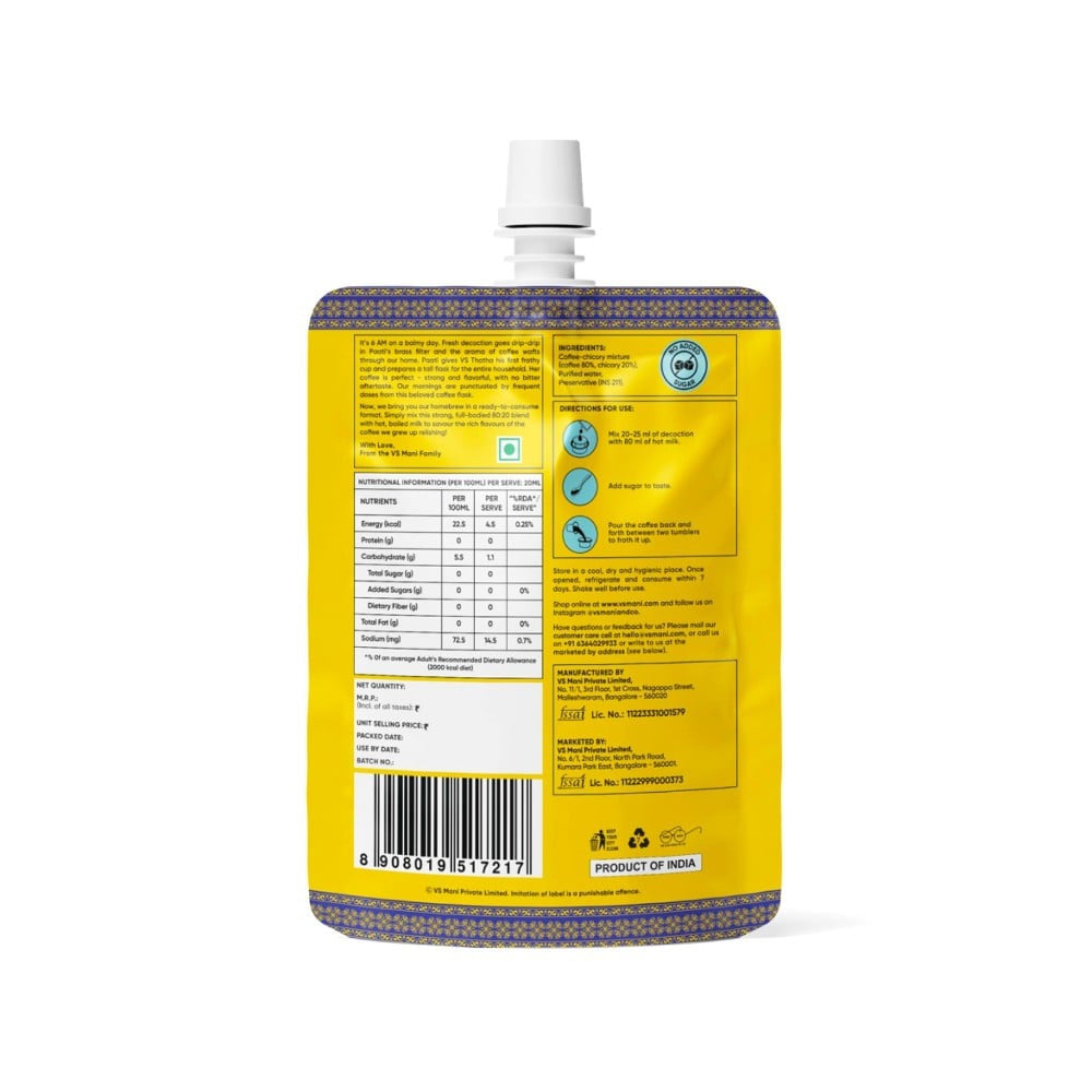 Introducing the VS Mani & Co. Easy Filter Coffee Decoction, a delightful blend designed for coffee enthusiasts who appreciate a rich and aromatic cup of filter coffee. This convenient decoction offers a quick and easy way to enjoy authentic South Indian filter coffee, perfect for busy mornings or a refreshing afternoon pick-me-up. Just pour, mix, and savor the rich flavors without the hassle of brewing your own coffee from scratch.