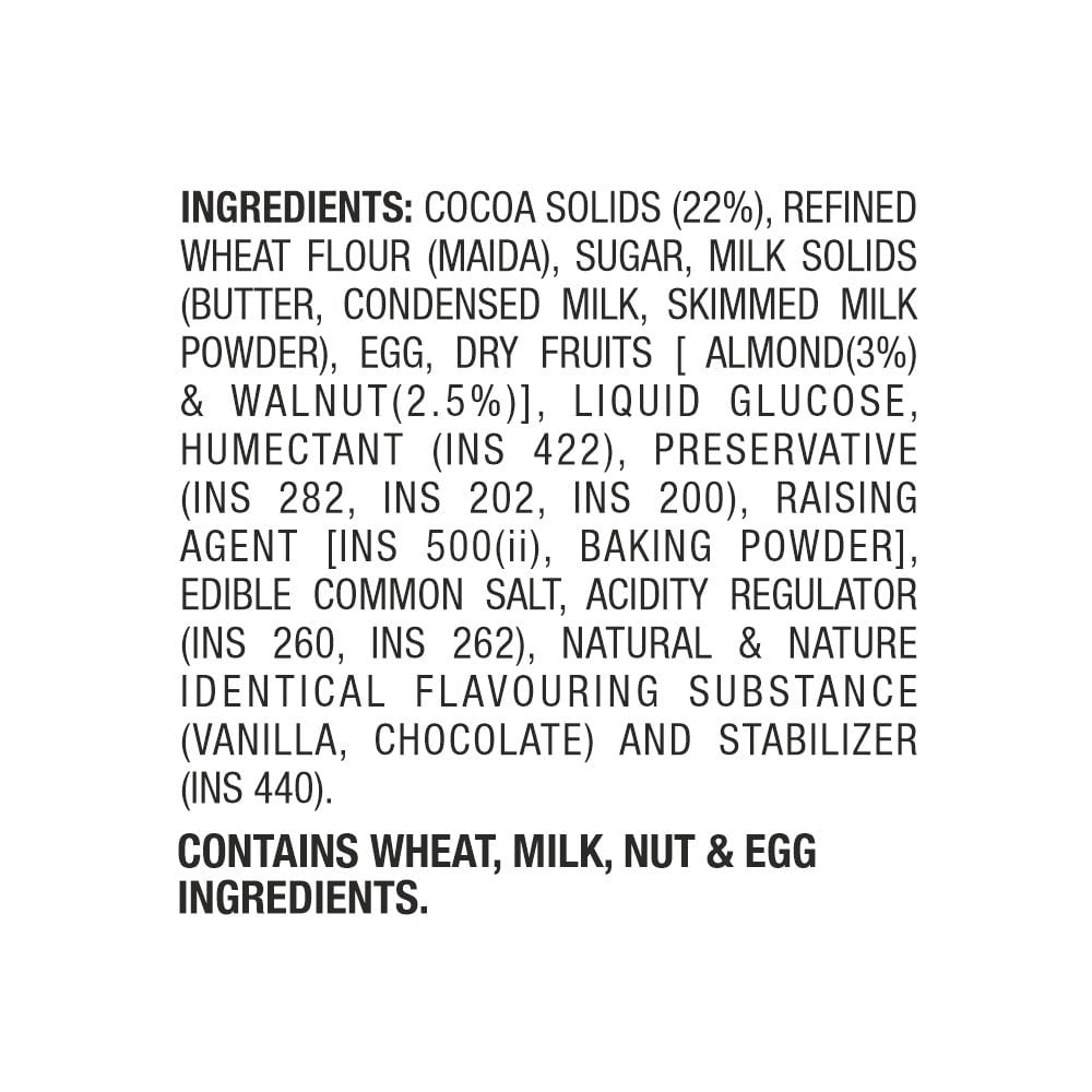 - Key Ingredients: Wheat flour, sugar, cocoa powder, vegetable oil, eggs, baking powder, and chocolate chips.