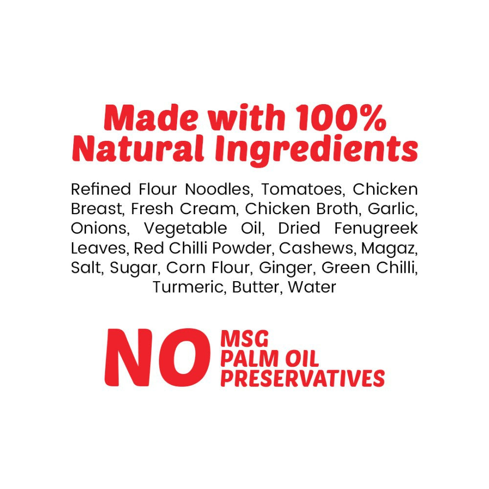 - Key Ingredients: Noodles, Butter Chicken seasoning, spices, and vegetables