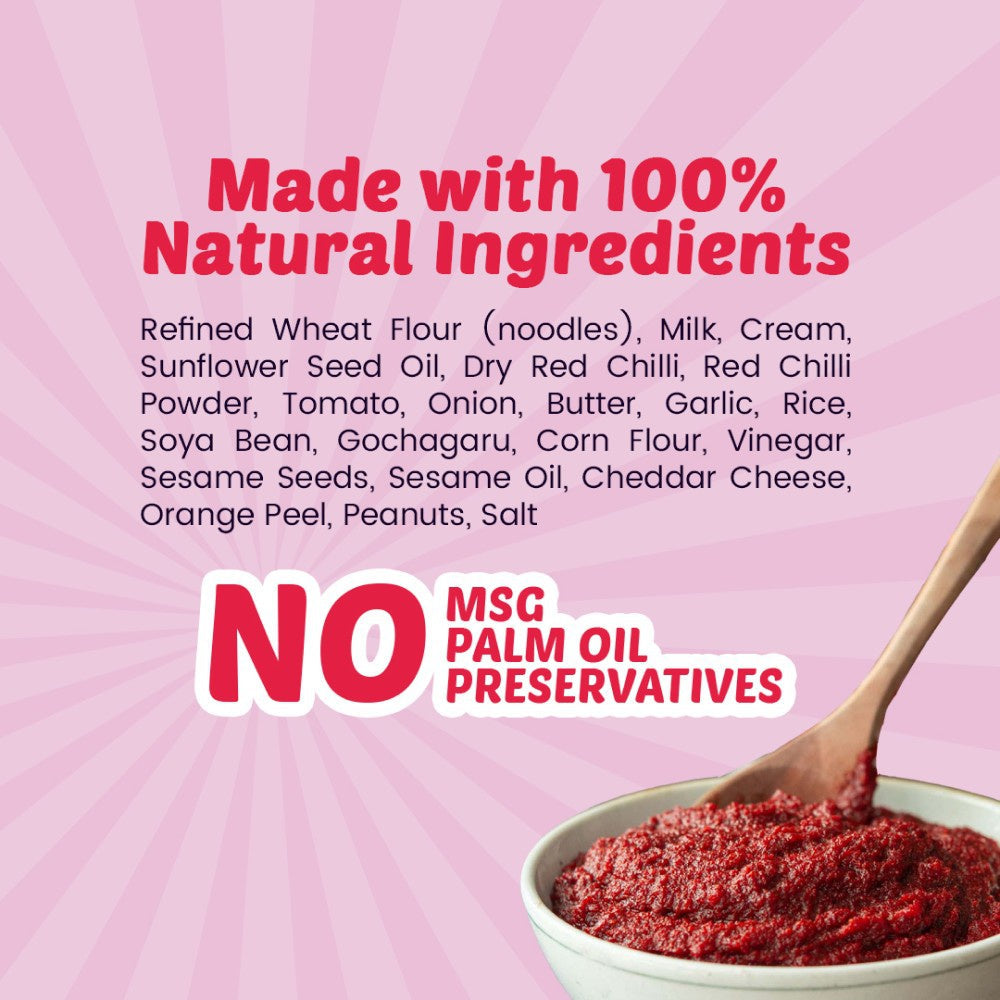 - Key Ingredients: Wheat Noodles, Hot Sauce, Seasoning, Cream Powder, Spices