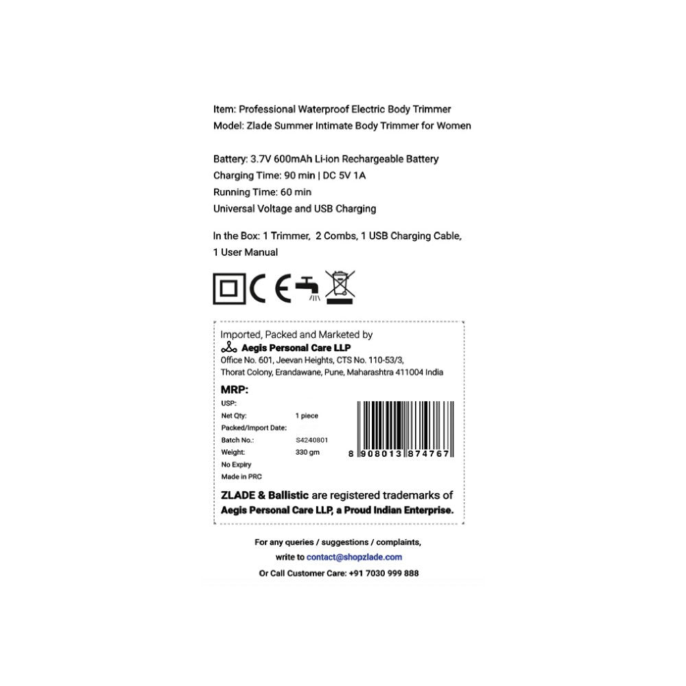 Zlade Summer Waterproof Electric Intimate Female Body Trimmer (Pink, 5W) : 1 unit